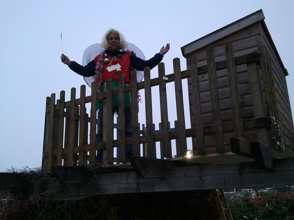 From 9.30am on Tuesday 7th December Richard Holloway, a member of our church, began his challenge dressed as a giant hairy fairy by attempting to stay on a platform (8’x8′) for up to a full week at Knights Ivy Mill Garden Centre, Godstone to raise funds for St Catherine’s Hospice. The challenge will end as soon as he descends from the platform for whatever reason. If you would like to support Richard’s challenge you can make a donation online at www.justgiving.com/hairyfairychallenge, direct to St Catherine’s Hospice Tel: (Fundraising Dept.) 01293 447376 or via collection tins at Knights Ivy Mill Garden Centre. The entire challenge, which can be seen on webcam, can be followed here. You will see from the picture that he has a small cabin on his platform. Unfortunately the chemical toilet Richard has been given wouldn’t fit in, so he can only use it when the Garden Centre is closed, and just in case you were wondering he covers up the webcam at appropriate moments! I’ve told Richard he must be completely mad – please give him your support by making a donation!