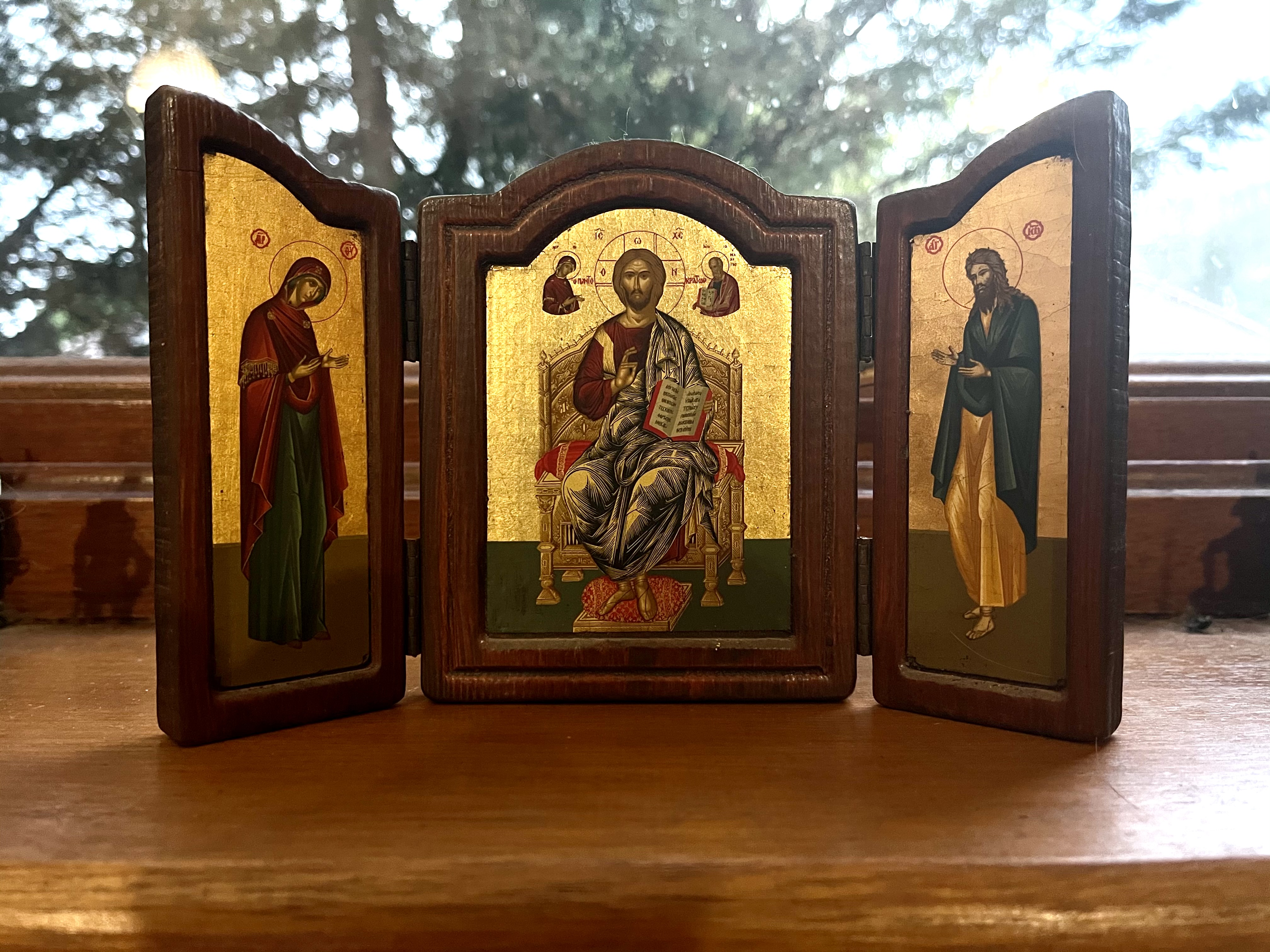 One of the things I like to take is what is called a travelling icon. An icon is a particular kind of religious picture, portraying Jesus, or his mother Mary, or one of the saints of the church. And a travelling icon is two or three small icons attached to each other with hinges, so they can stood up, or be folded up so that it can be taken with you when you travel.